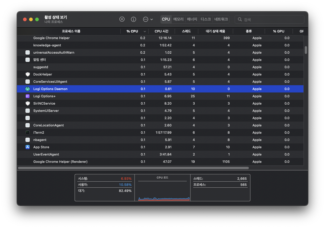 활성 상태 보기 (Activity Monitor) 에서 logi Options Daemon 을 강제 종료하면 정상 동작한다.