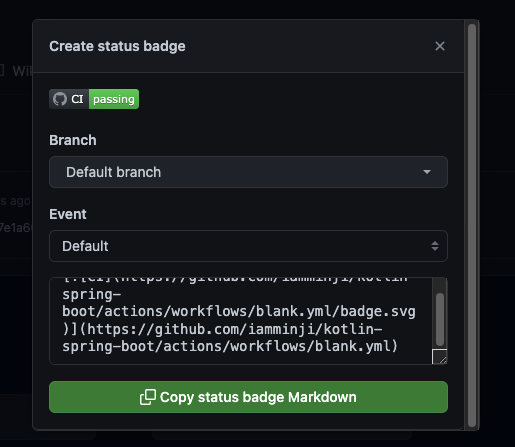 workflow 결과 상태를 badge 로도 보여줄 수 있다. workflow 로 가서 우측의 Create status badge 를 눌러준다.