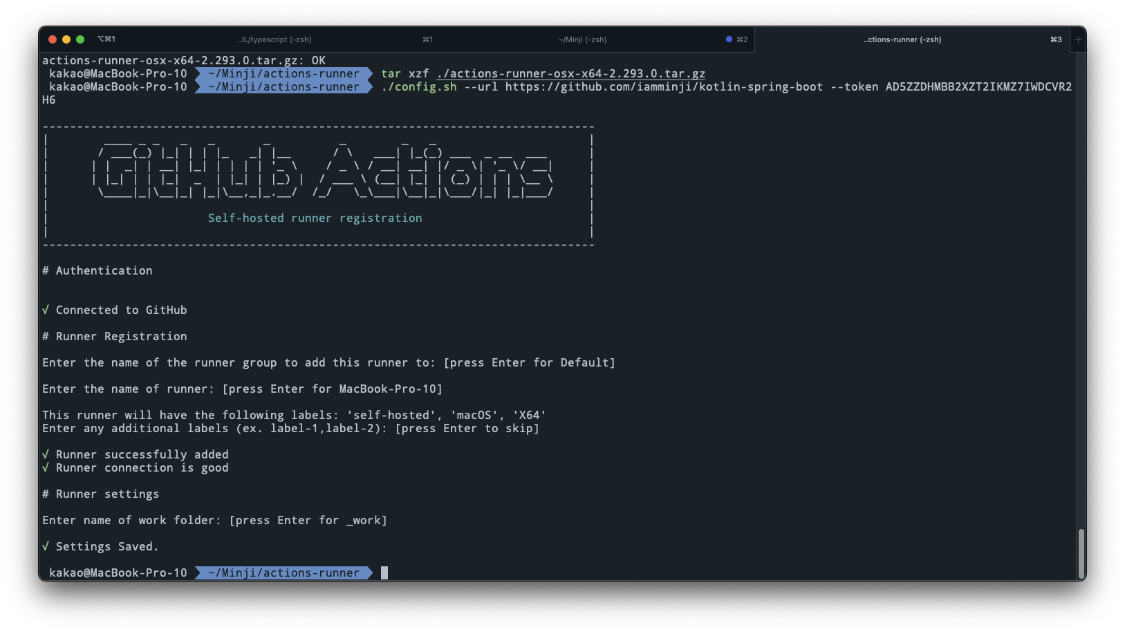 설정 중 This runner will have the following labels: 'self-hosted', 'macOS', 'X64' 이라는 걸 볼 수 있는데 이는 내 runner 의 label 을 붙여주는 작업이다. 여기서는 가장 기본 값이 붙었는데, 이 값을 어디서 사용하냐면 runs-on: self-hosted 으로 workflow yml 파일에서 사용하는 것이다.